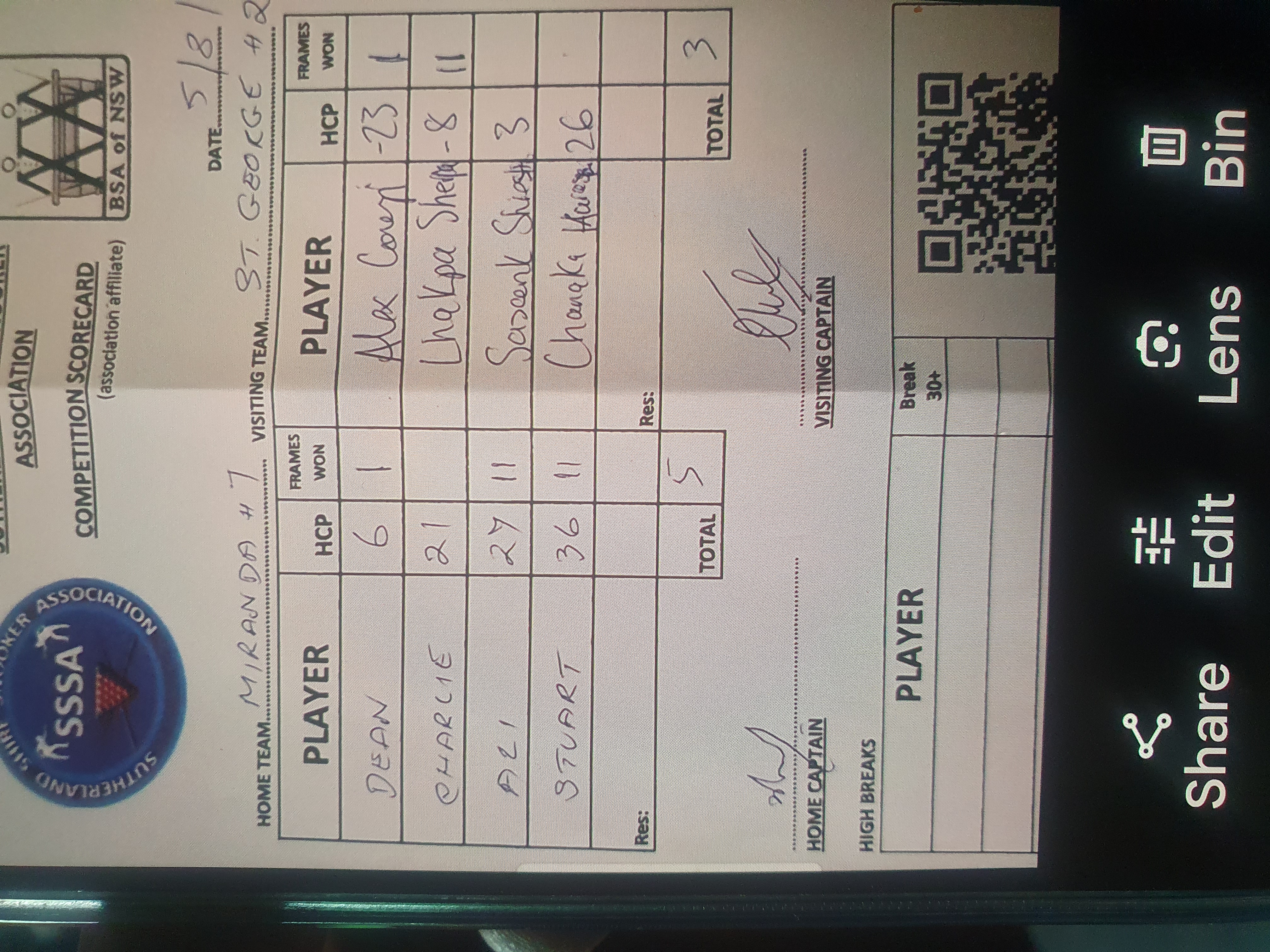 POS | Miranda RSL #1 | Frame Won | Break | St George #2 | Frame Won | Break | Result Note | Updated on | Update by |
