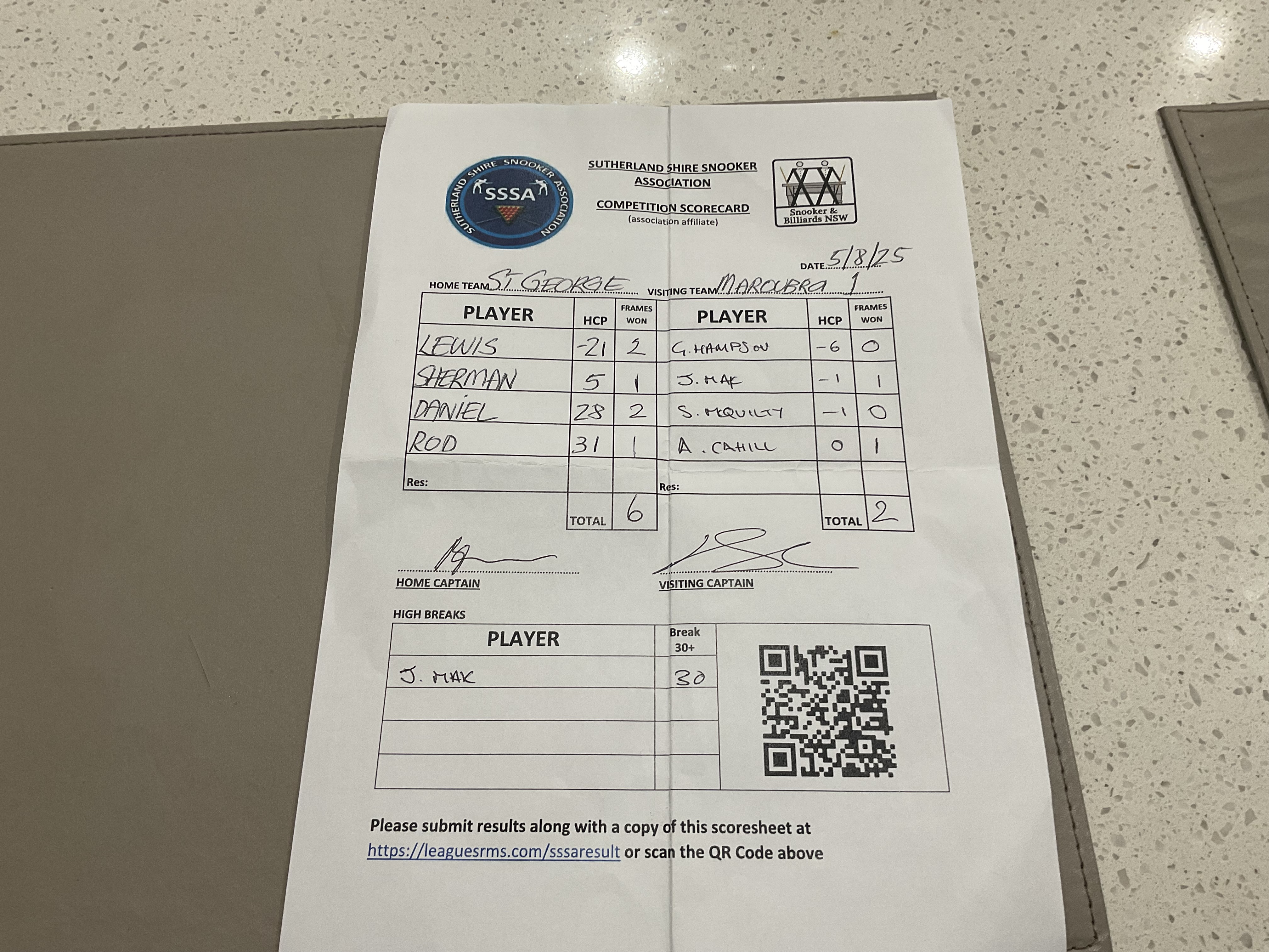 POS | St George #1 | Frame Won | Break | Maroubra Seals #1 | Frame Won | Break | Result Note | Updated on | Update by |