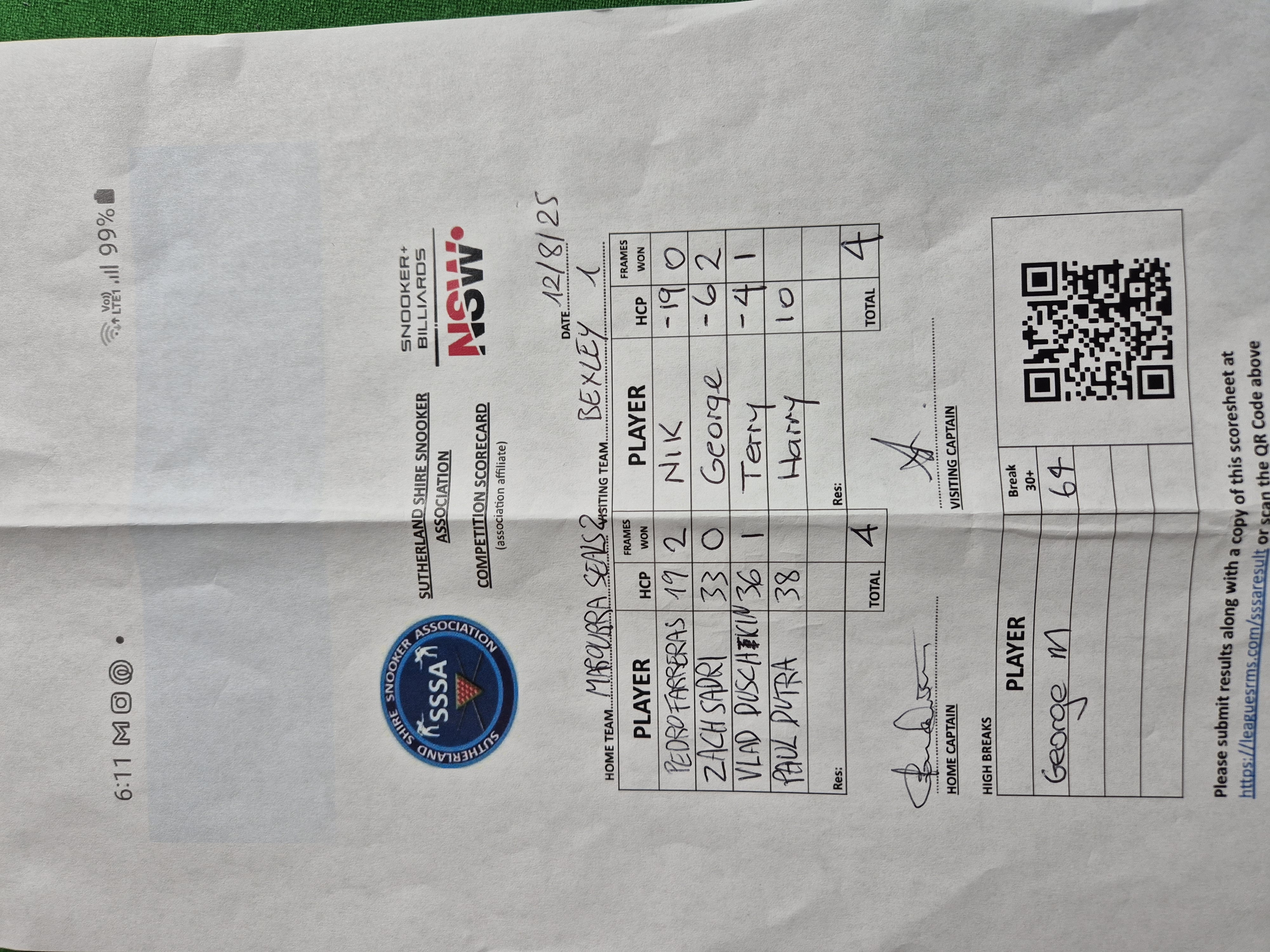 Zac Sadri (33) | George Mariglis (-6) | 2025-08-12 22:08:12 | Bexley RSL #1 | ||||||