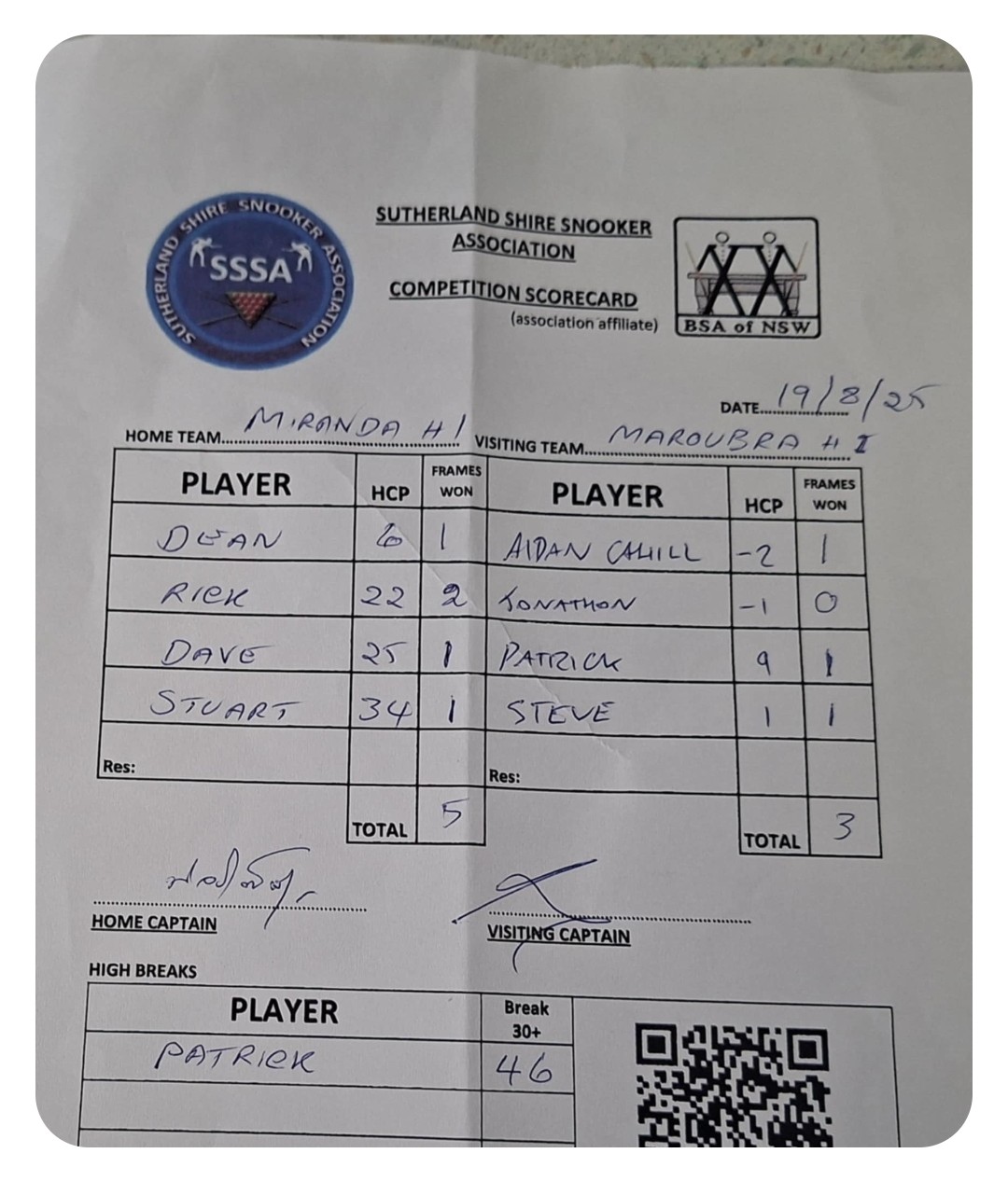 POS | Miranda RSL #1 | Frame Won | Break | Maroubra Seals #1 | Frame Won | Break | Result Note | Updated on | Update by |