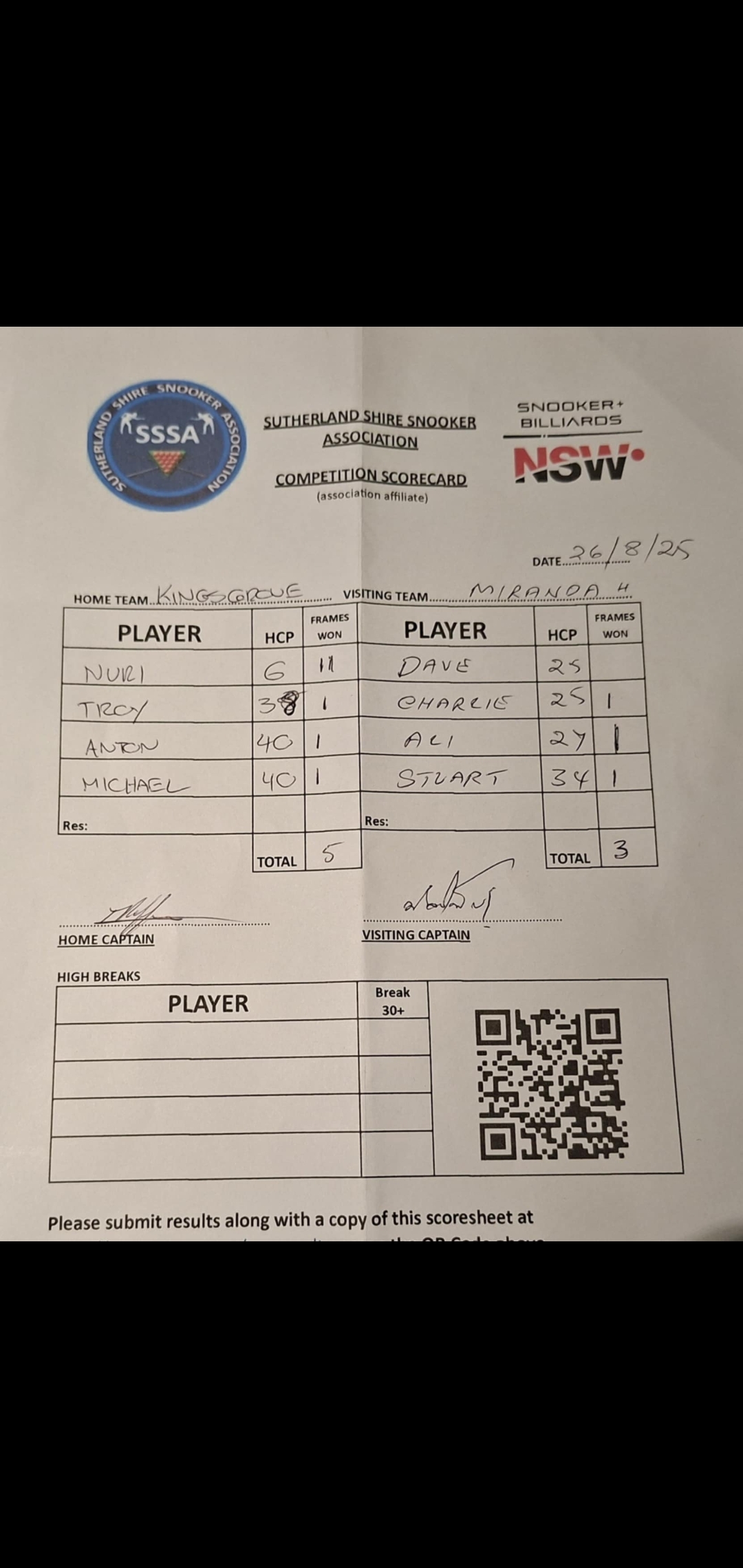 POS | Kingsgrove #1 | Frame Won | Break | Miranda RSL #1 | Frame Won | Break | Result Note | Updated on | Update by |