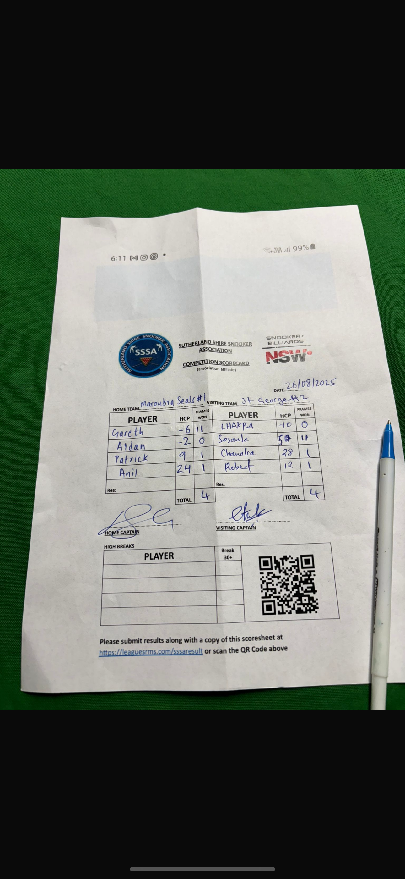 POS | Maroubra Seals #1 | Frame Won | Break | St George #2 | Frame Won | Break | Result Note | Updated on | Update by |