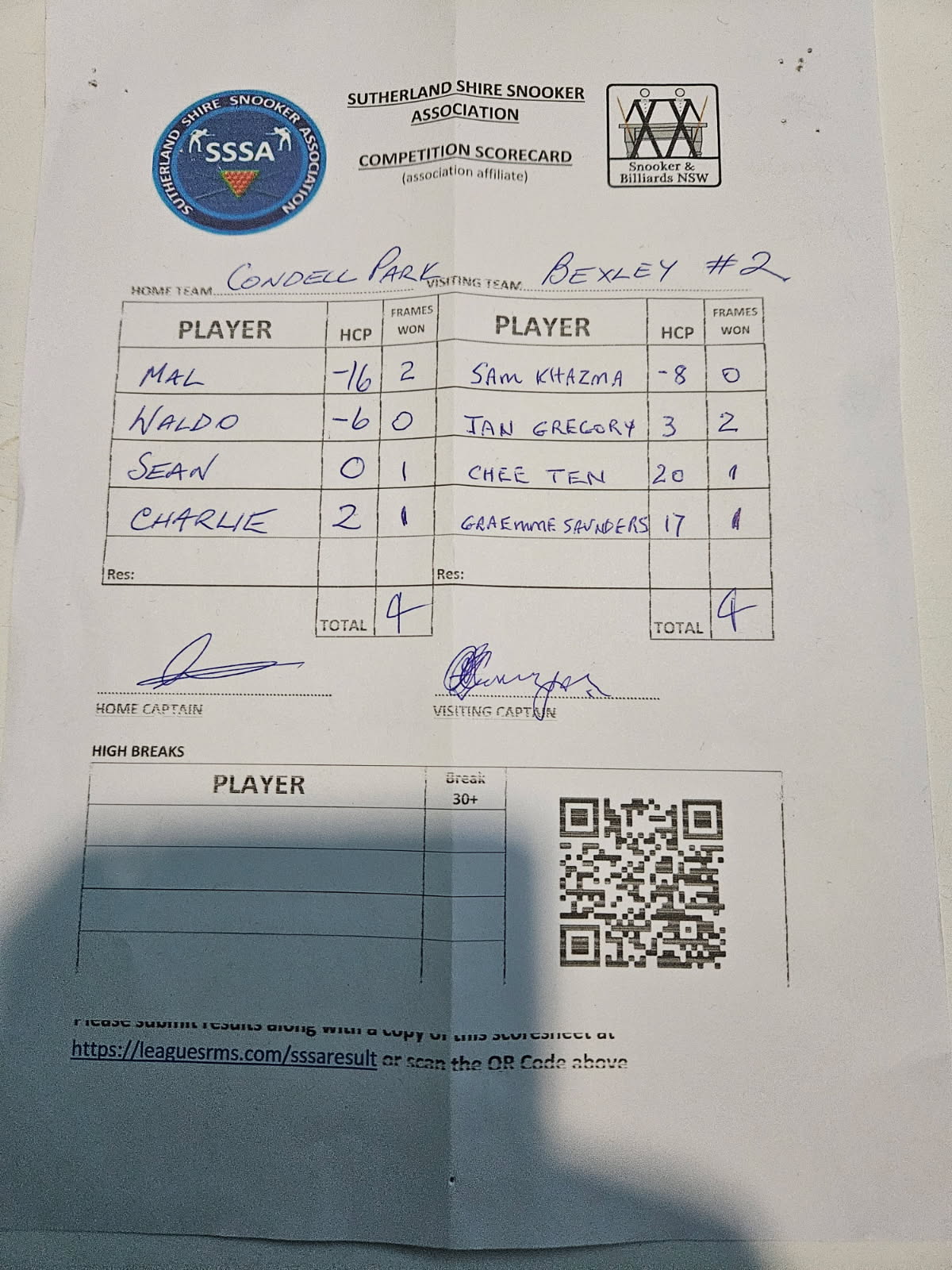 POS | Condell Park #1 | Frame Won | Break | Bexley RSL #2 | Frame Won | Break | Result Note | Updated on | Update by |
