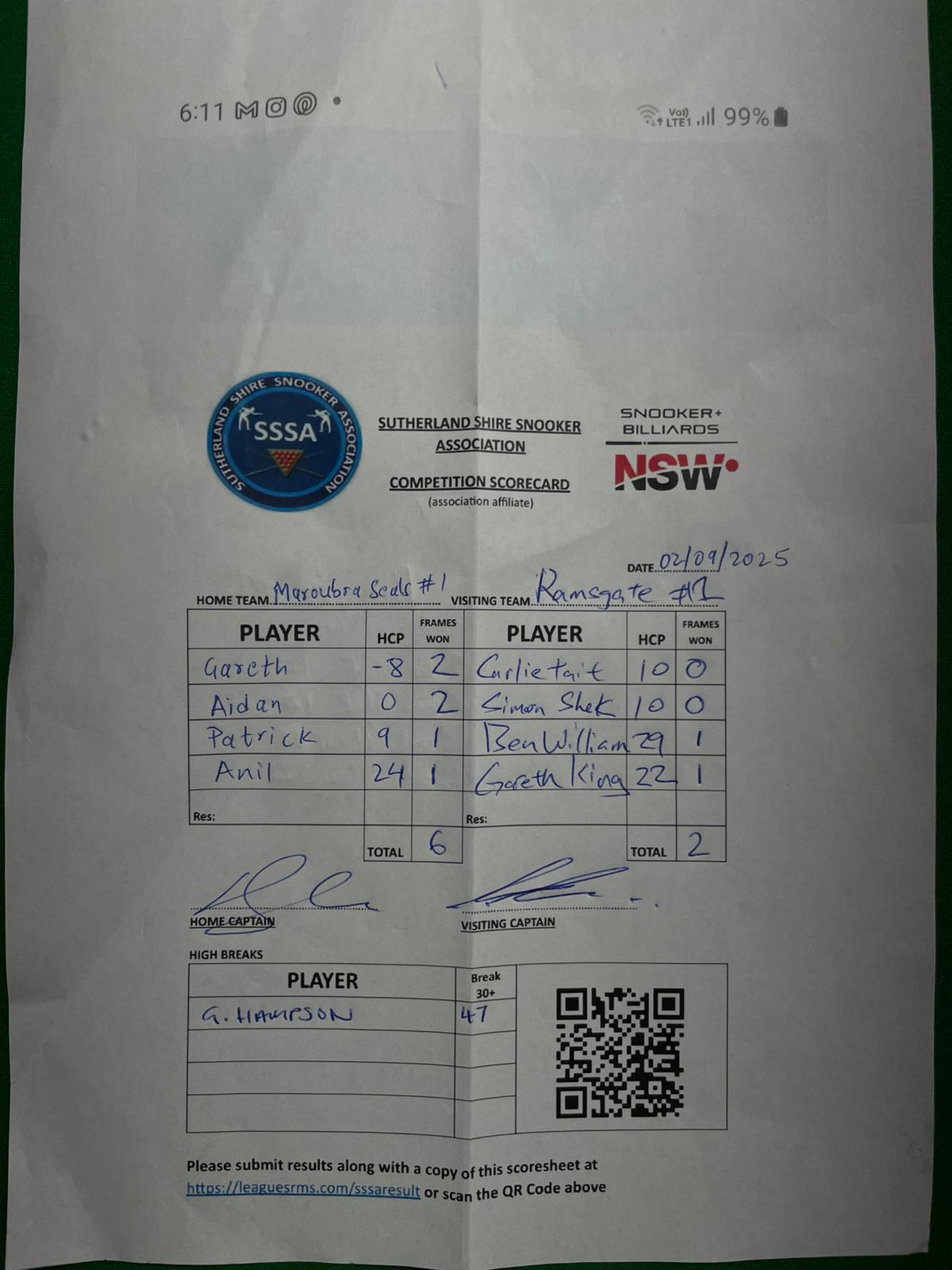 POS | Maroubra Seals #1 | Frame Won | Break | Ramsgate RSL #1 | Frame Won | Break | Result Note | Updated on | Update by |