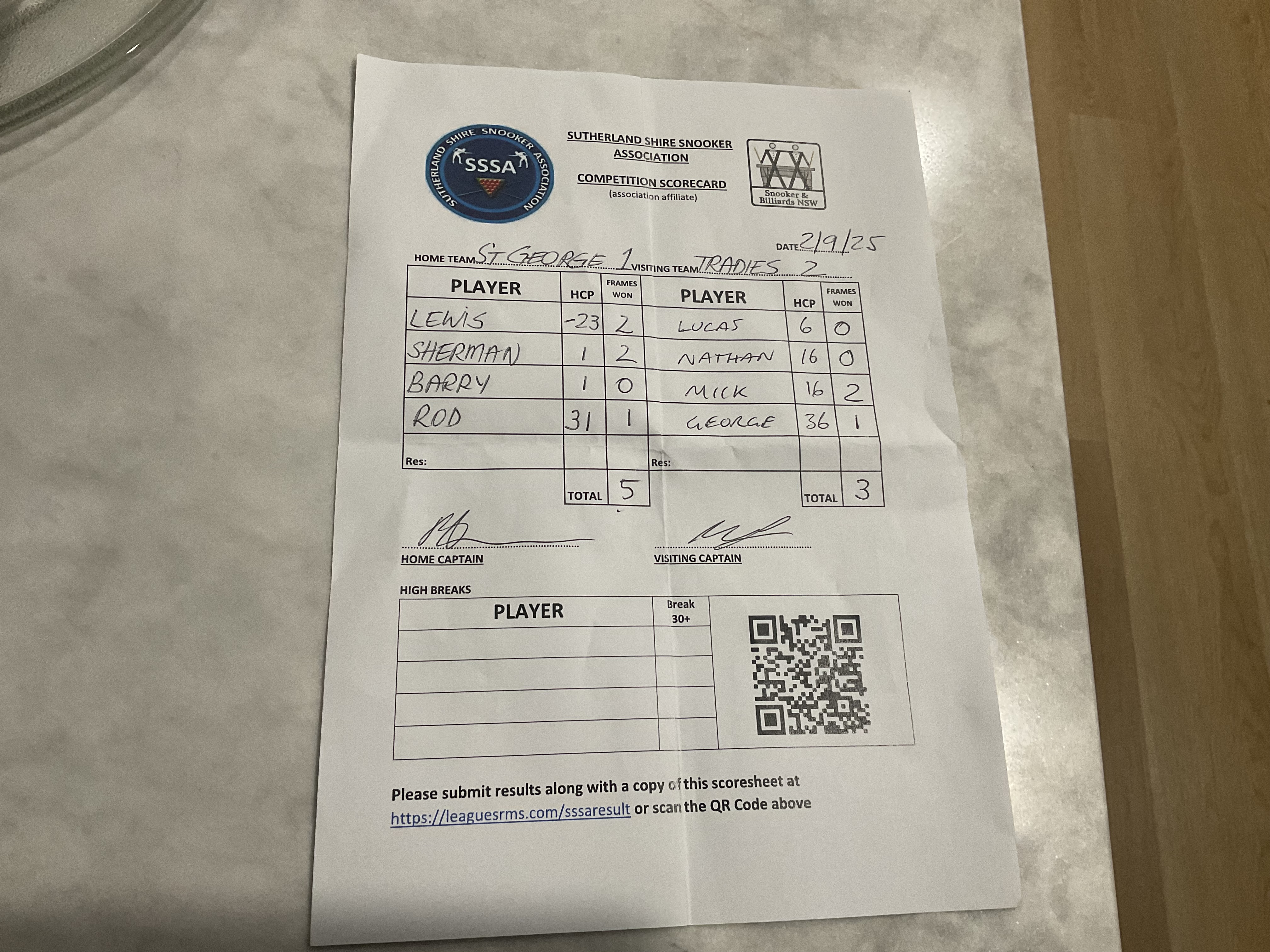 POS | St George #1 | Frame Won | Break | Tradies #2 | Frame Won | Break | Result Note | Updated on | Update by |