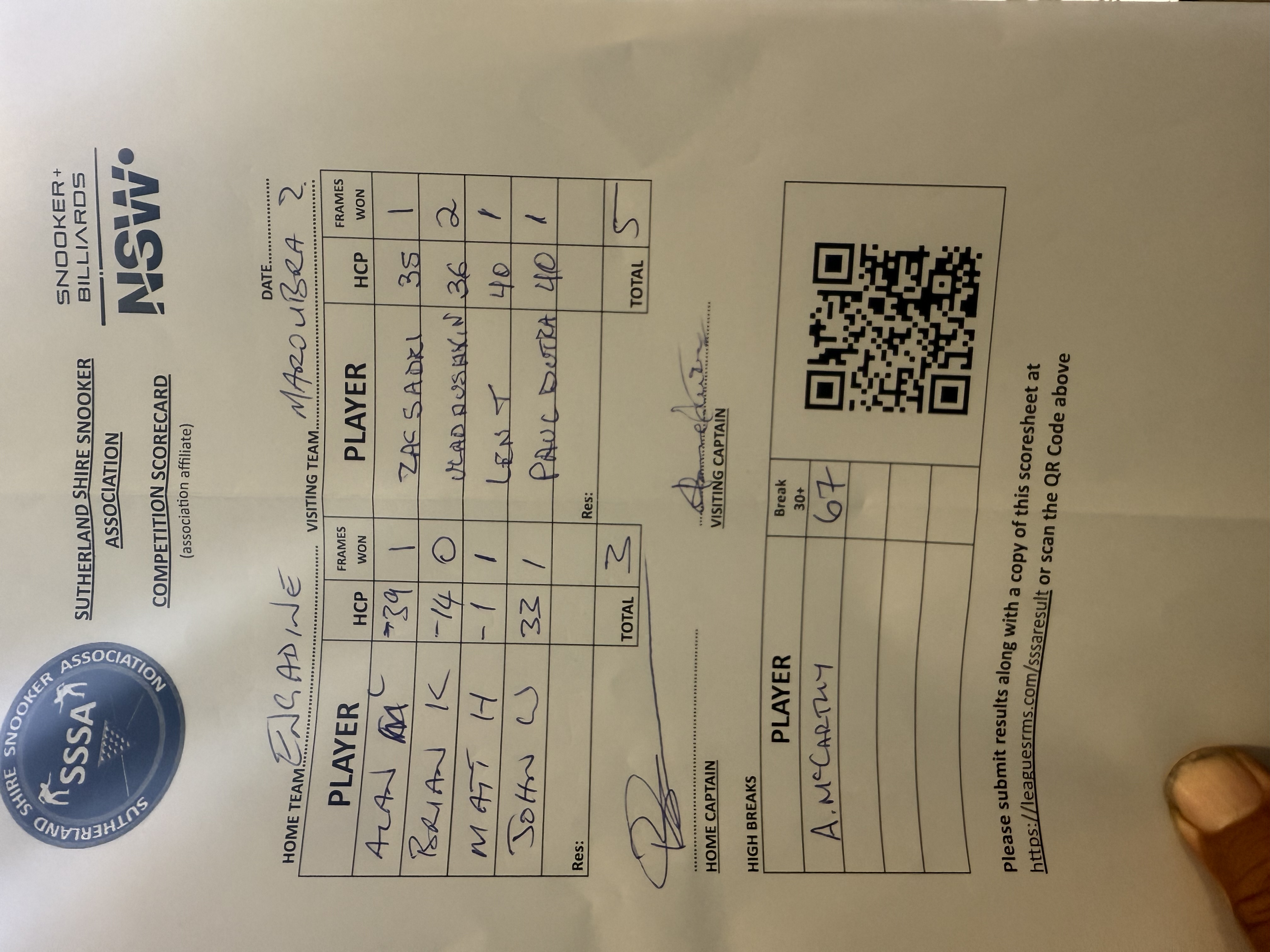 POS | Engadine #1 | Frame Won | Break | Maroubra Seals #2 | Frame Won | Break | Result Note | Updated on | Update by |