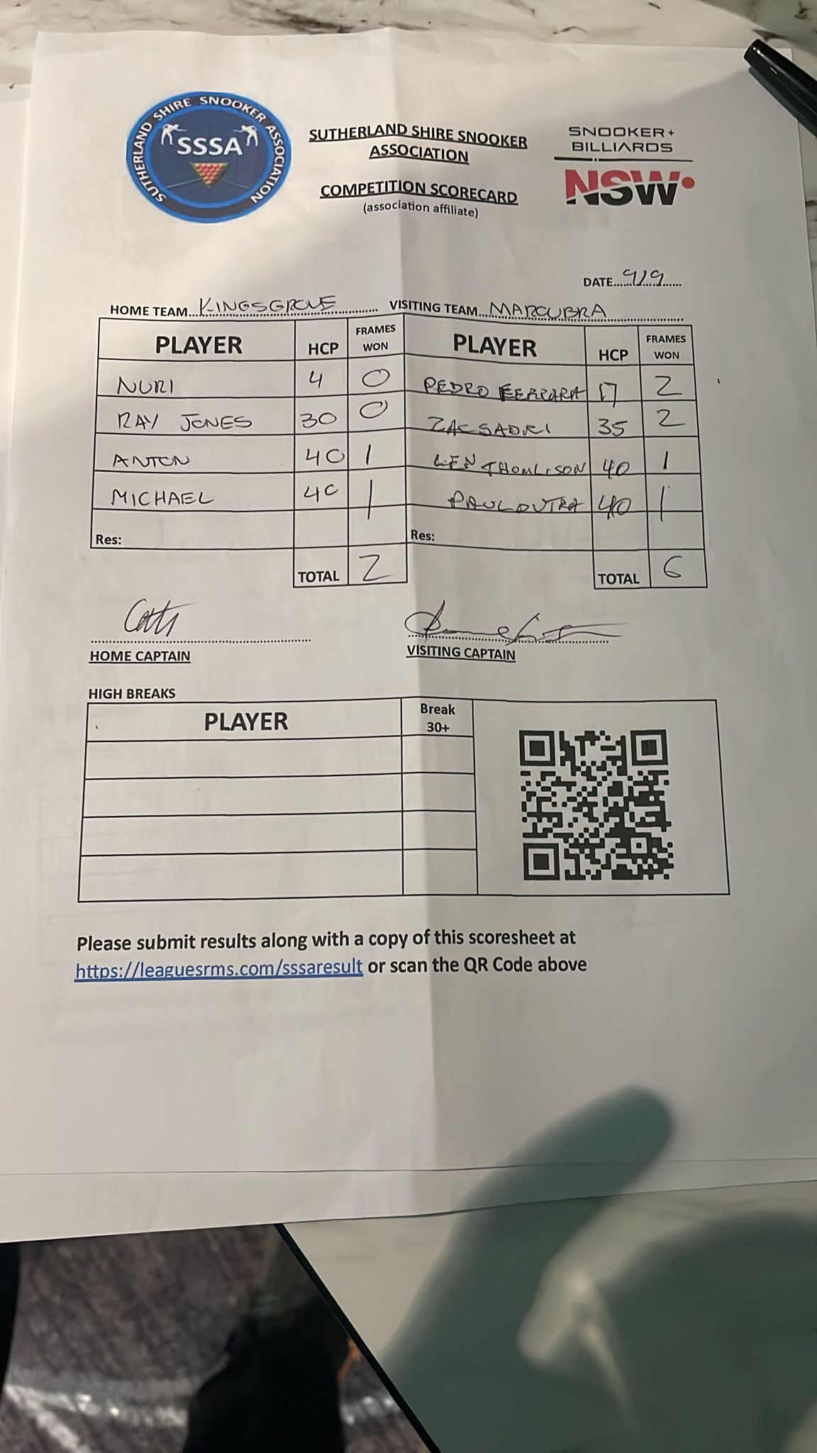 POS | Kingsgrove #1 | Frame Won | Break | Maroubra Seals #2 | Frame Won | Break | Result Note | Updated on | Update by |