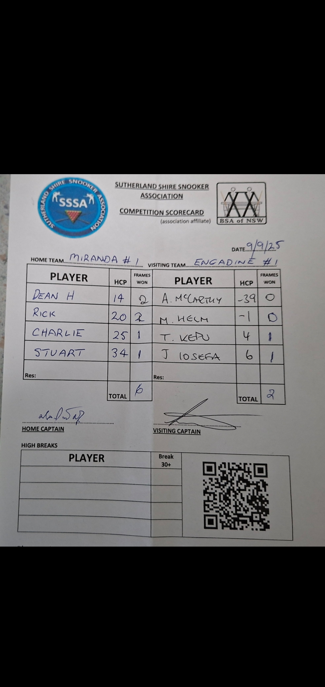 POS | Miranda RSL #1 | Frame Won | Break | Engadine #1 | Frame Won | Break | Result Note | Updated on | Update by |