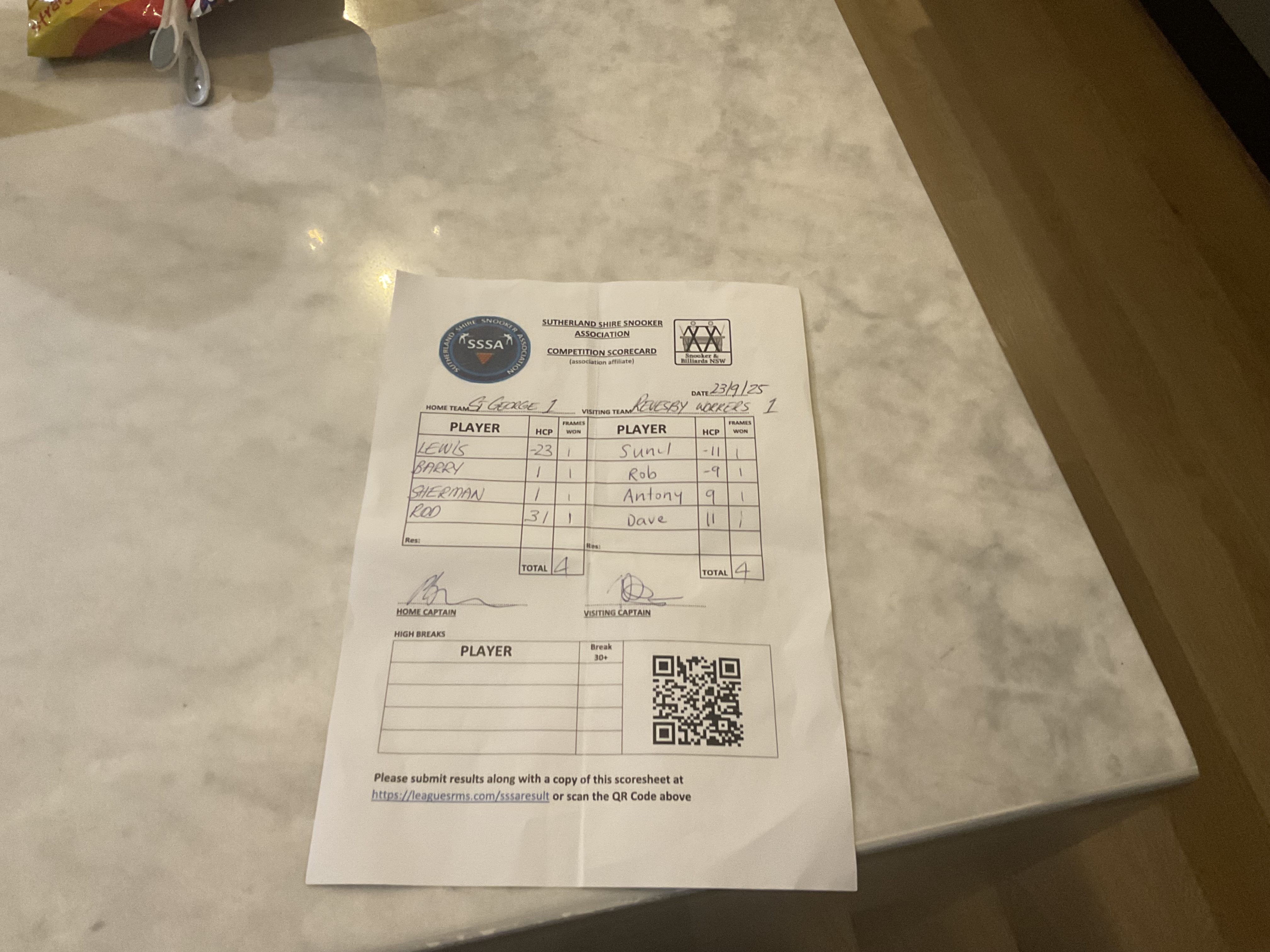 POS | St George #1 | Frame Won | Break | Revesby Workers #1 | Frame Won | Break | Result Note | Updated on | Update by |