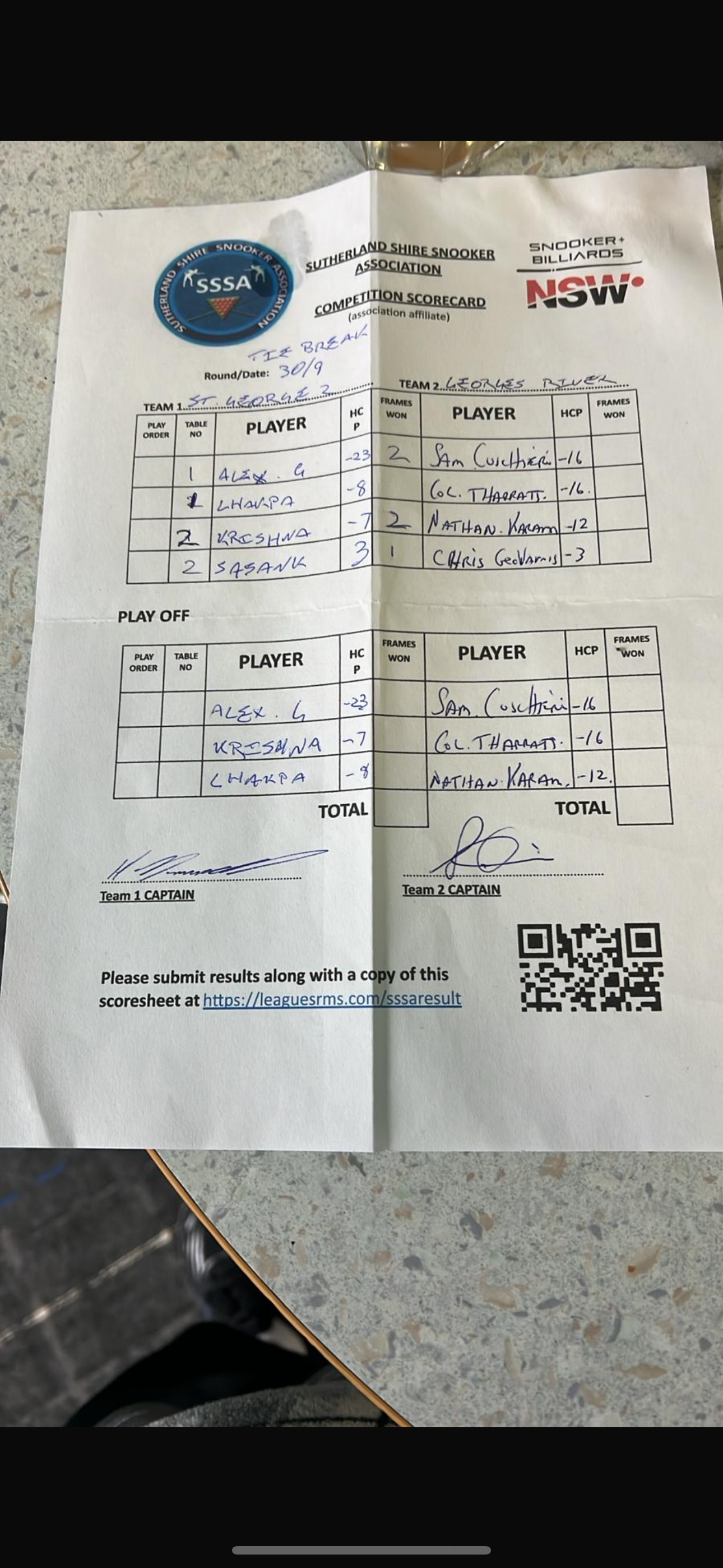POS | Georges River #1 | Frame Won | St George #2 | Frame Won | Result Note | Updated on | Update by |