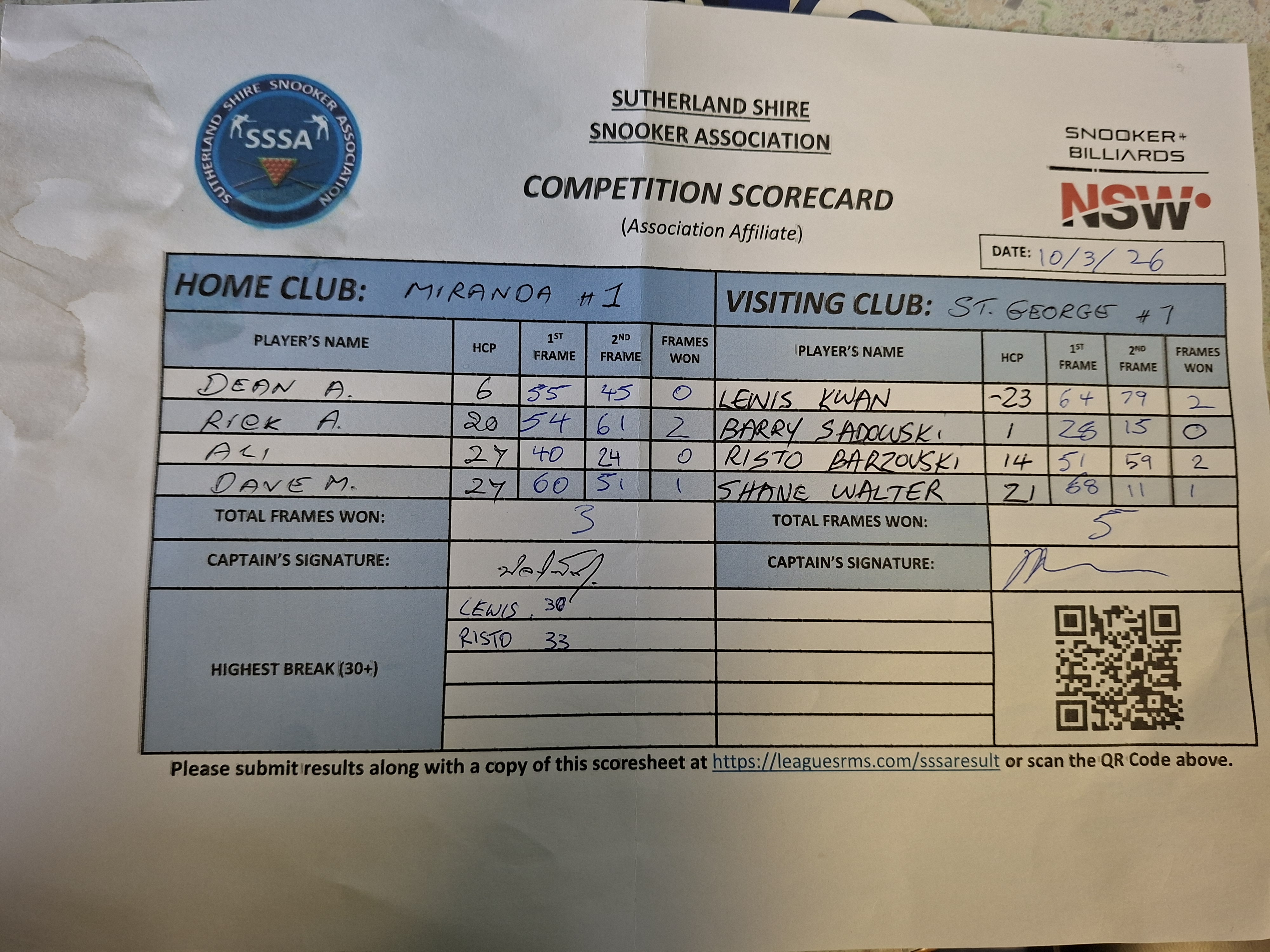 | POS | Miranda RSL #1 | 1st Frame | 2nd Frame | Frame Won | Break | St George #1 | 1st Frame | 2nd Frame | Frame Won | Break | Result Note |